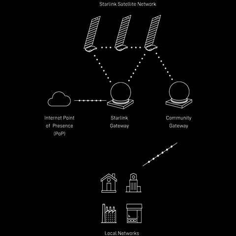 With Community Gateways, Starlink satellites are able to deliver fiber-like speeds with local providers distributing connectivity to homes, businesses, and governments using last-mile fiber, fixed wireless and mobile wireless. The Community Gateway traffic transits through Starlink's global laser mesh network and utilizes our high bandwidth Gateways operating in a dedicated Ka spectrum band.