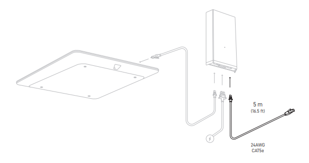 El kit plano de alto rendimiento incluye un cable de 8 metros. Si 8 metros no son suficientes para la instalación, puede comprar un cable de 25 metros en la tienda de Starlink. Debido a los requisitos de energía, el cable que conecta la fuente de alimentación a la antena no se puede extender más de 25 metros. El radio de curvatura mínimo para este cable es de 10 cm (4 pulg.).