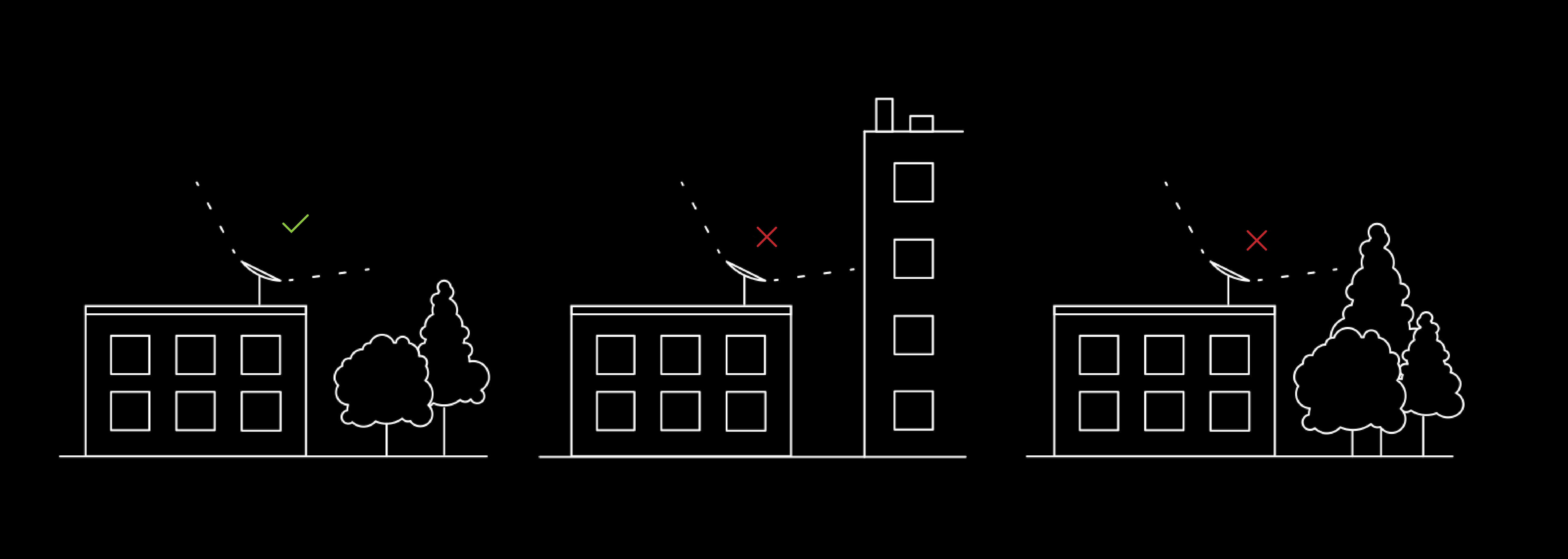 Use the app to find the set up location that will deliver the best service. Your Starlink needs a clear view of the sky so it can stay connected with satellites as they move overhead. Objects that obstruct the connection between your Starlink and the satellite, such as a tree branch, pole, or roof, will cause intermittent outages and dropped packets.