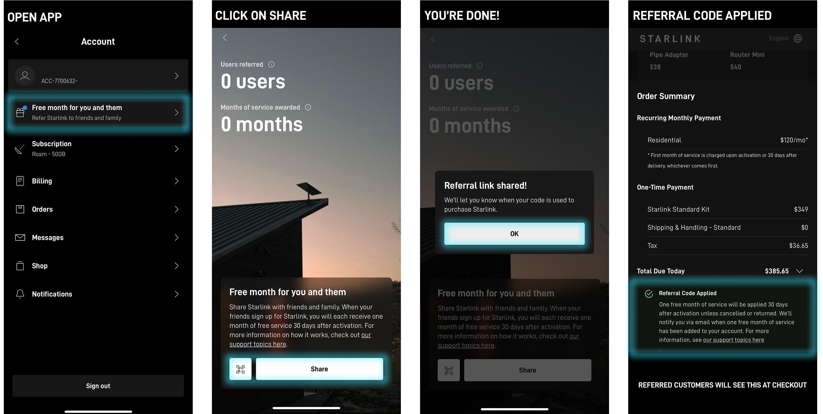 - In the Starlink app, select the 'person' icon and then "Free month for you and them". (This is “Referrals” online).